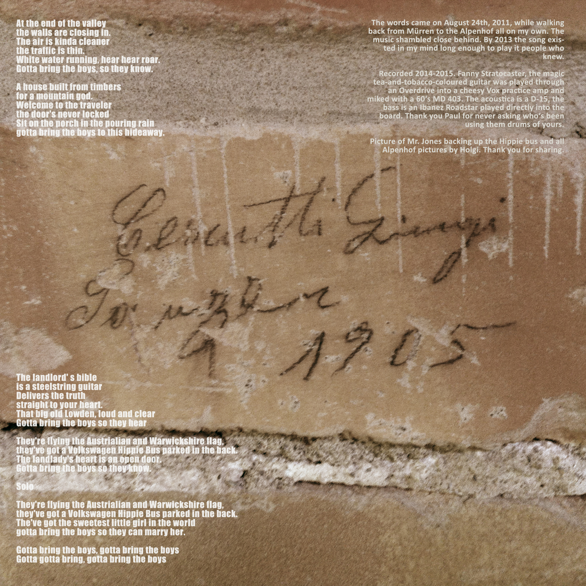 I wrote this song while walking down from Mürren, Switzerland, to the Alpenhof in Stechelberg, 2011. When it comes to feeling welcome, friendly and a little Hippie, the Alpenhof is the closest to Alice's restaurant that you can get to this side of the Atlantic Ocean. It's about how it is and how important it seems to confer to my little boys that there will be more important things in life than getting an education, finding a good job and accumulating security until you eventually die. This is a happy song. |