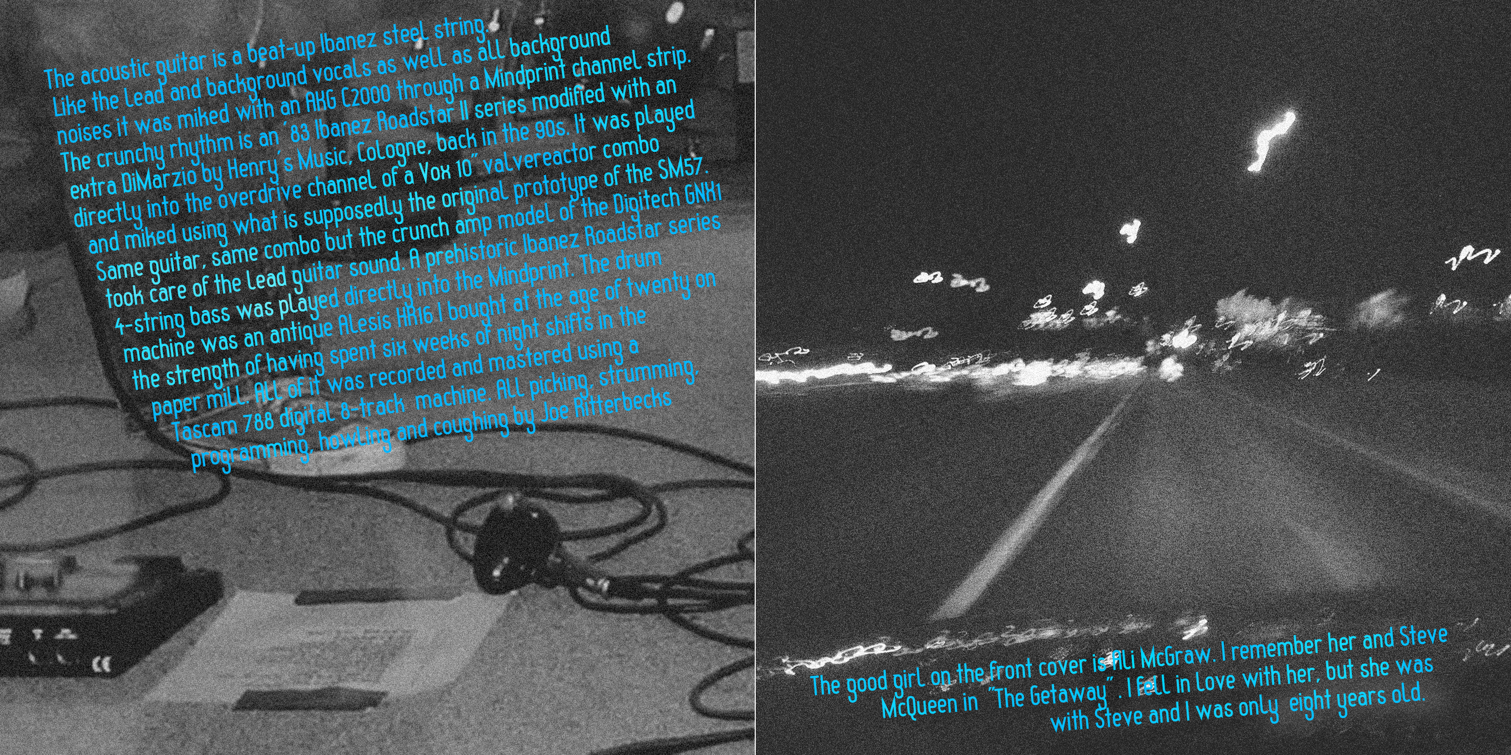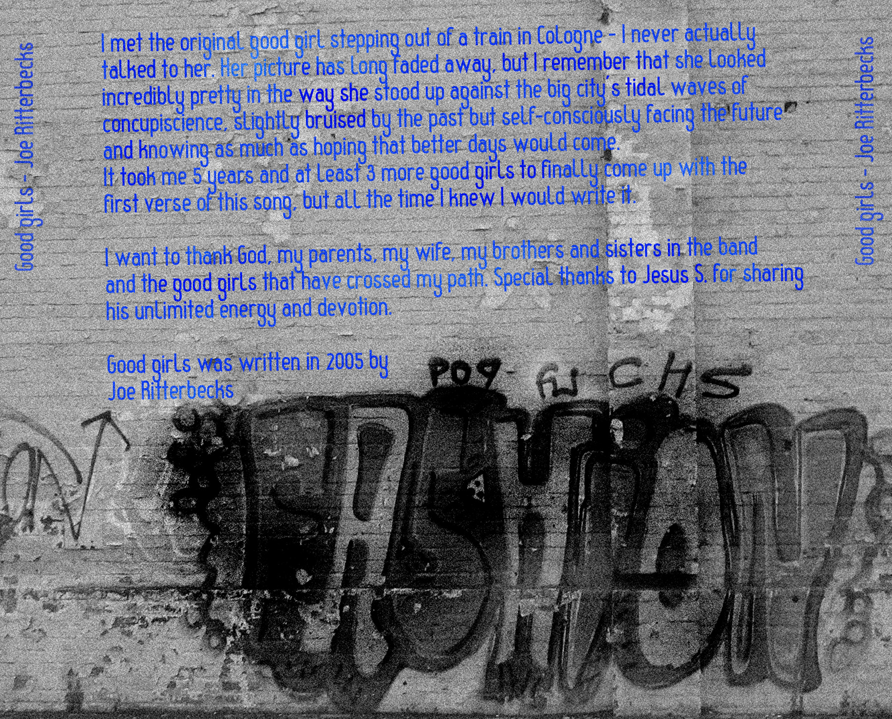 Joe Ritterbecks For those who stumble across this page... here's a little background, here's the lyrics and sleeves, all the extras that are part of the creative process, that the online stores won't carry. Songwriting and recording has been with me since the early 90s, surviving from vinyls and compact cassettes to That's how I hope the song's come through - to whoever finds them. Felt... lived through... not engineered to meet a |