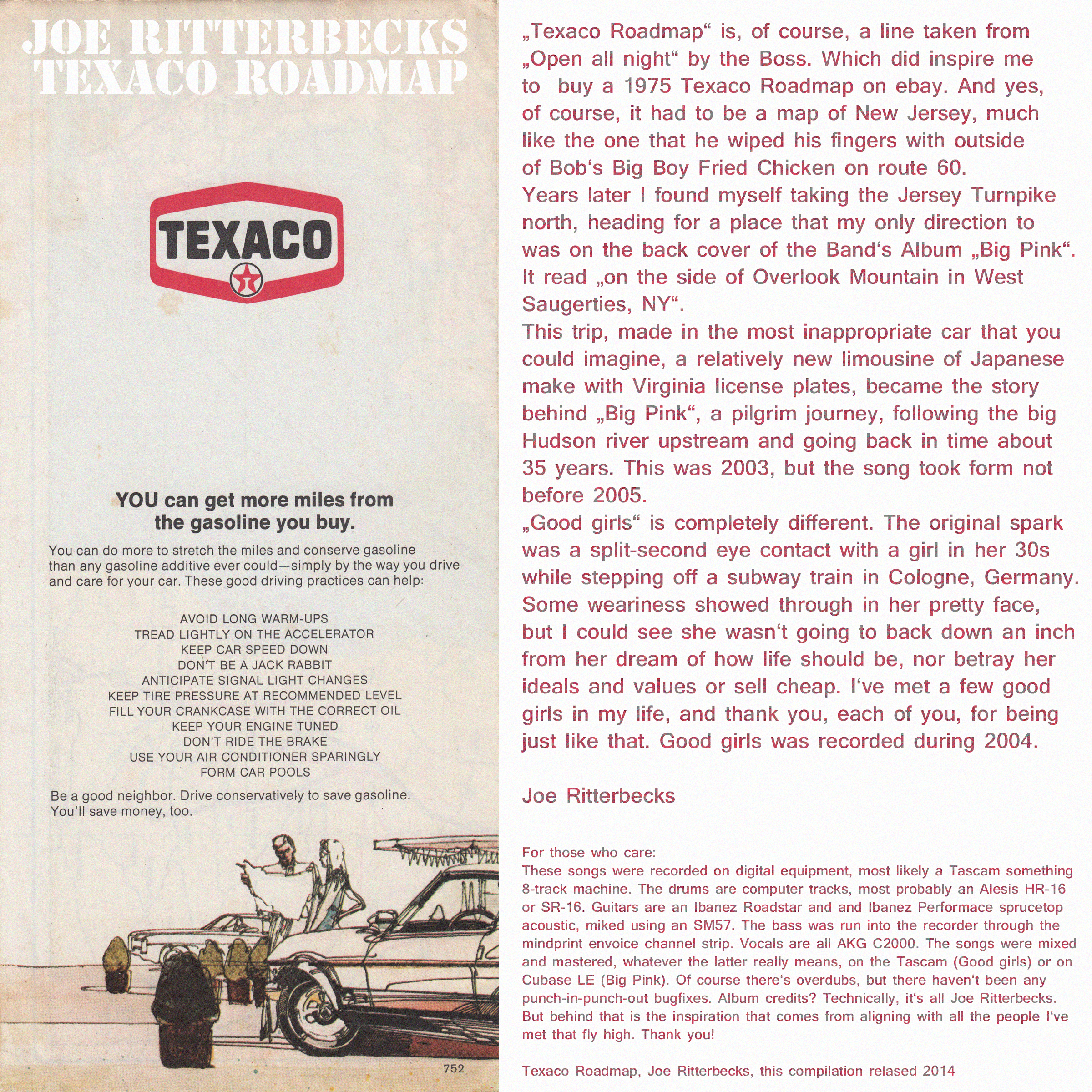 At the end of a turbulent year in many aspects, I was thinking about my life in a general way. Looking from the outside, it was probably pretty much straightforward and successful. "Joe's got everything", somebody said. It felt different from the inside. Was I in control of my life, going where I wanted to? Or was I going down the river like driftwood, just lucky not to get stuck in the dead water on the far side of a bend? Somehow it felt right to start sharing the songs I had in the drawer, so I released "Big Pink" and "Good Girls" under their working title "Texaco Roadmap", just before Christmas, 2014. As a present to myself, and a promise. It's an EP, because Big Pink is as much an A-side as Good Girls is. |